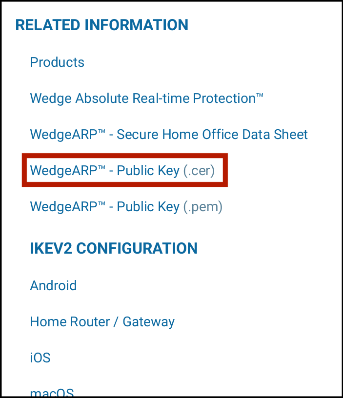 2. Under Related Information, click on the hyperlink WedgeARP™ - Public Key (.cer) to download the certificate file directly into the Firefox browser.