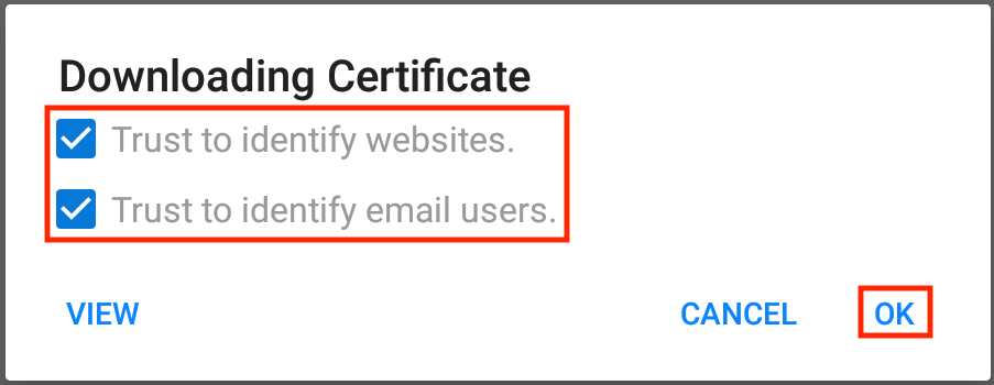 3. In the Downloading Certificate dialog box, select both Trust to identify websites and Trust to identify email users, then tap OK.