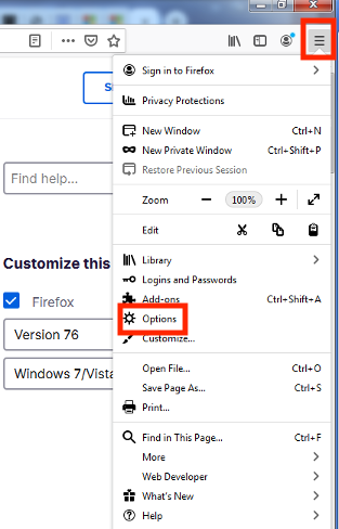 1. Open your Mozilla Firefox browser and click on the menu icon on the top right corner of the window. Then select Options on the side menu. This will bring up the Options tab.