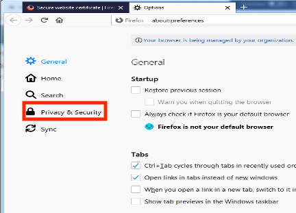 2. On the Options tab, select Privacy & Security on the left hand side.