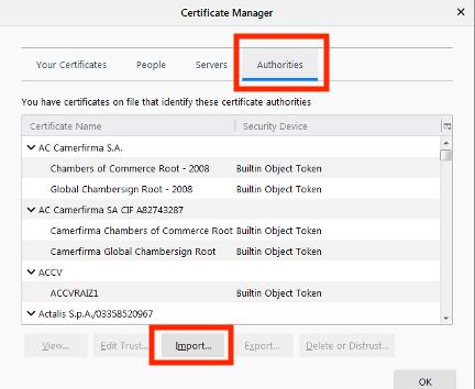 4. The Certificate Manager window will pop up. Make sure that the Authorities tab has been selected and click on the Import button.