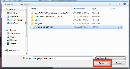 5. A file explorer window will pop up to allow you to select the certificate that you had previously installed on your computer. Select the Wedge Security certificate and click on Open.