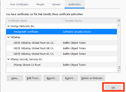 7. The Wedge Security certificate should show up under the Authorities tab. Click OK to close the window and to finish the importing the certificate.