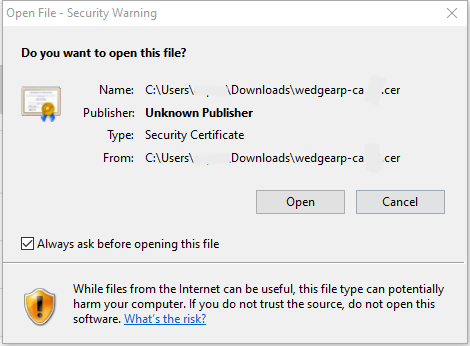3. Once downloaded, double click on the file "wedgearp-ca.cer". Press Open once the following dialog box appears.