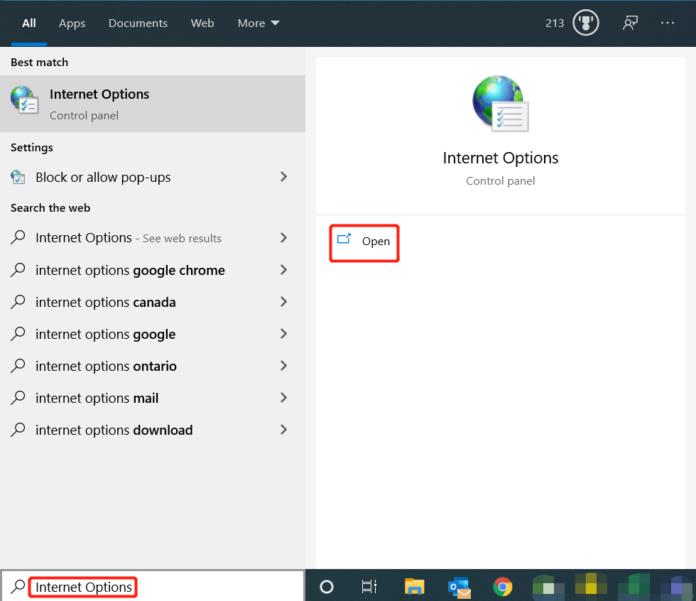 11. To verify that the certificate was properly installed, go to the Start menu and type in "Internet Options" and click on Open.