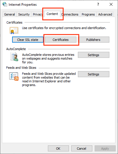 12. Once the Internet Properties dialog box comes up, navigate to the Content tab and click on Certificates to get the Certificates dialog box.