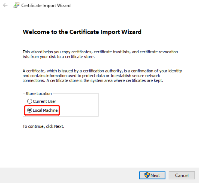 5. The "Certificate Import Wizard" dialog box will appear. Click on the radio button "Local Machine" and click Next to continue.