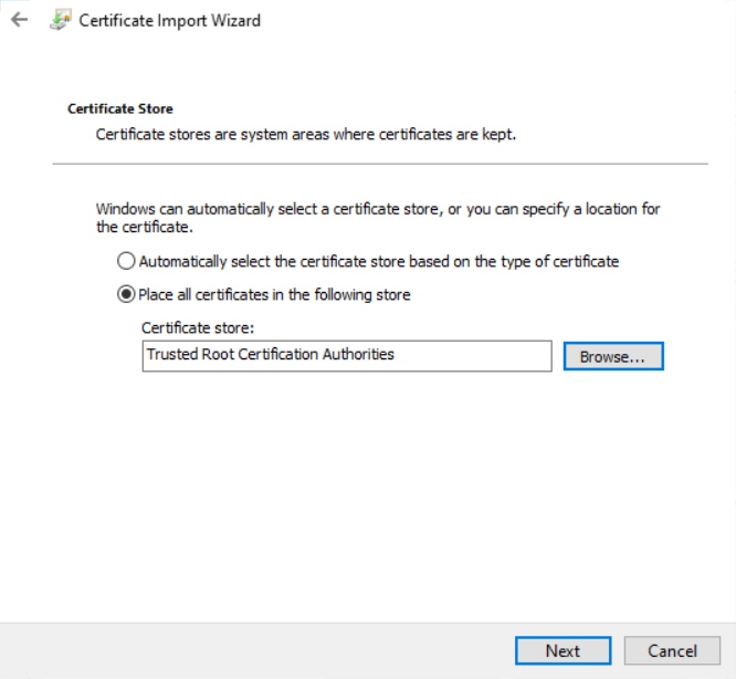 7. Choose the radio button "Place all certificates in the following store" and then click on the Browse button.