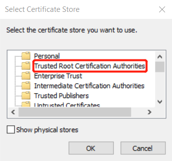 8. The following "Select Certificate Store" dialog box will appear. Click on "Trusted Root Certificate" and then OK.