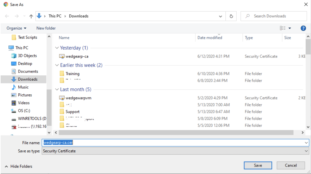 1. First, you have to install the security certificate provided by Wedge Networks. Please download the WedgeARP™ - Public Key to your computer. In order to avoid any conflicts with any previous Wedge security certificates, please remove any previously installed Wedge security certificates before proceeding.