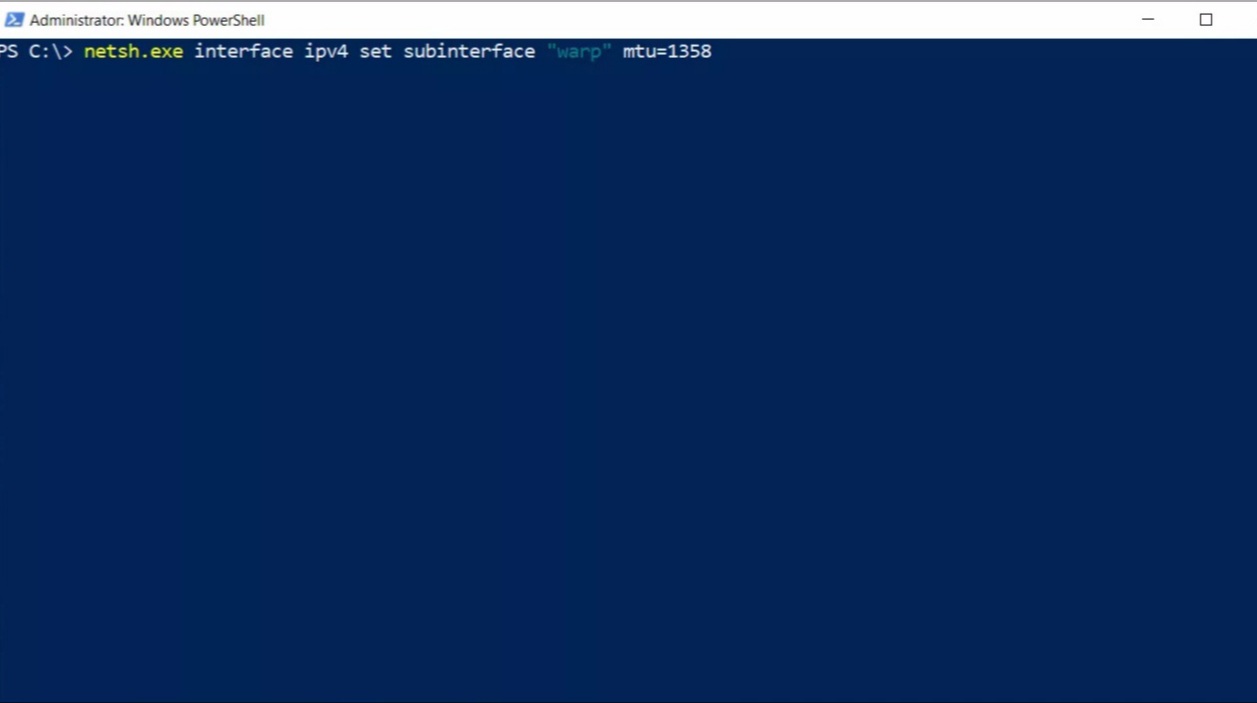"netsh.exe interface ipv4 set subinterface "warp" mtu=1358" (or any lower value than 1358).