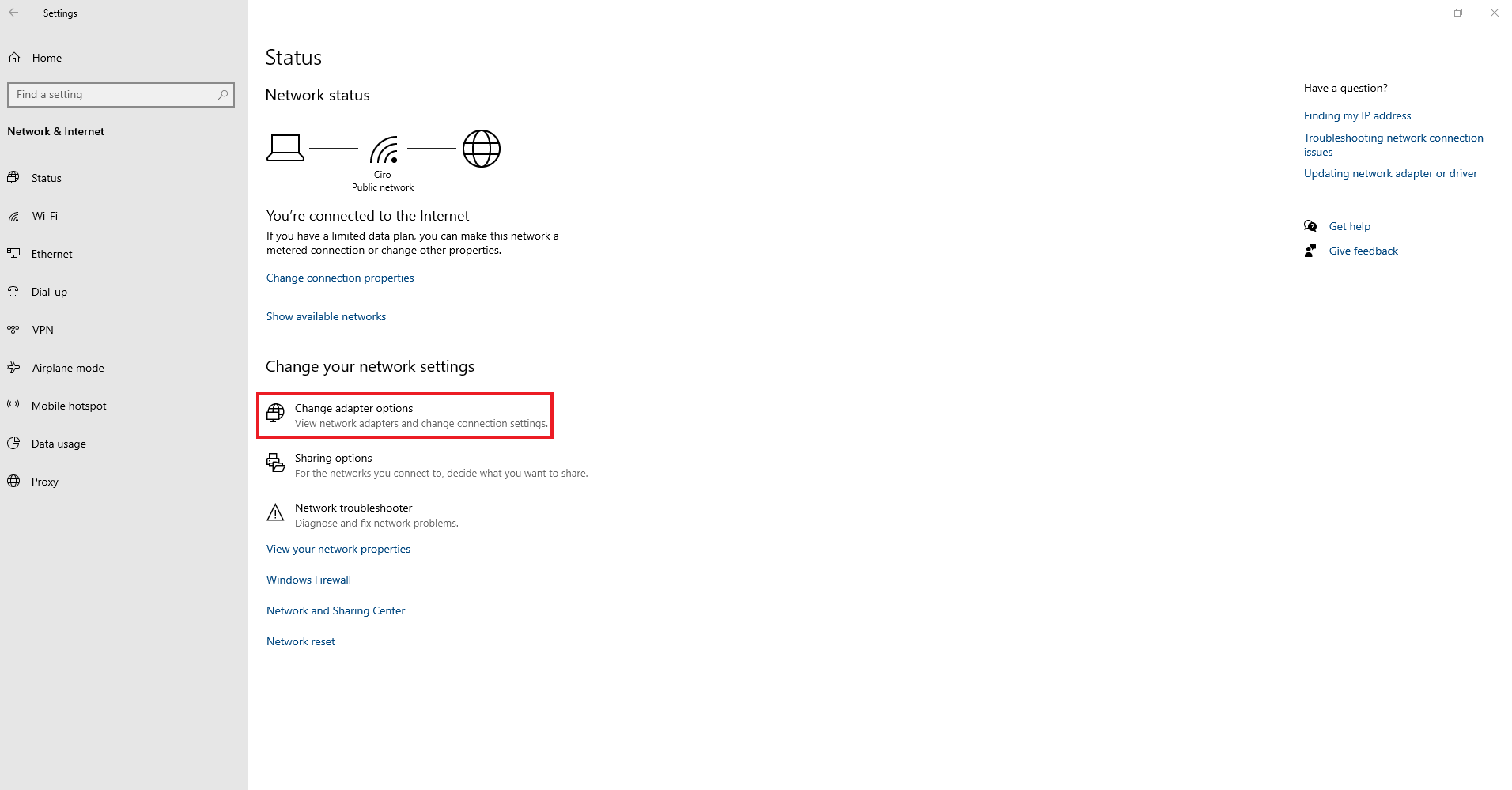 18. Next, navigate to Status on the Network & Internet Settings page and click on Change adapter options.