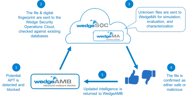 WedgeMA is hosted in the Wedge Security Operations Cloud (WedgeSOC). WedgeAMB users have the option to subscribe to the service and allow their WedgeAMB appliances to automatically forward blocked web content or files that are suspected of containing malware, but unconfirmed as malware (1).